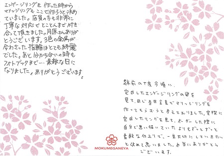 世界に一つだけの指輪が出来ました。 三重県 I.I様 S.K様 (お渡し担当:住谷)