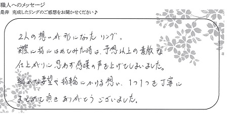 あらためまして、この度は素敵な指輪の完成、誠におめでとうございます。