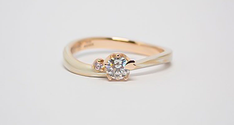 日本の伝統技術「木目金」と「さくらダイヤモンド」の輝きで職人がつくりあげる世界にひとつの婚約指輪です。