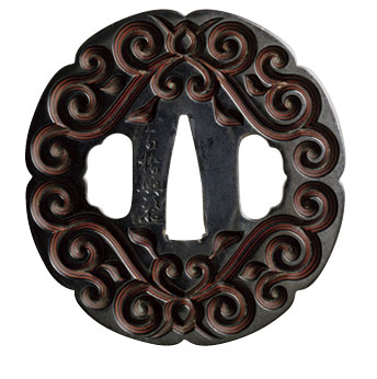 木目金の技術は、江戸時代初期、正阿弥伝兵衛が考案したグリ彫りの鐔に始まると伝えられています。グリ彫りとは銅、赤銅などの色の異なる金属を交互に幾重にも接合したものに、唐草文や渦巻文を彫り下げる技術で、彫った部分に金属の積層模様が現れます。その起源はアイヌの民族文様の影響を受けたとされる説もありますが、中国の漆による「屈輪(ぐり)」が起源との説が一般的です。この屈輪についてまずご説明します。