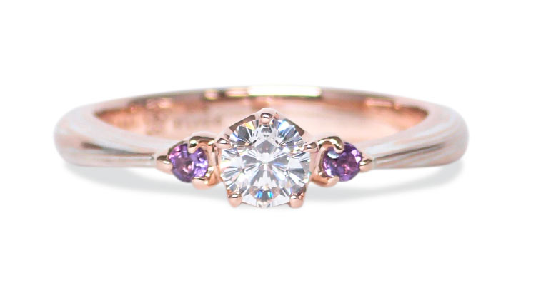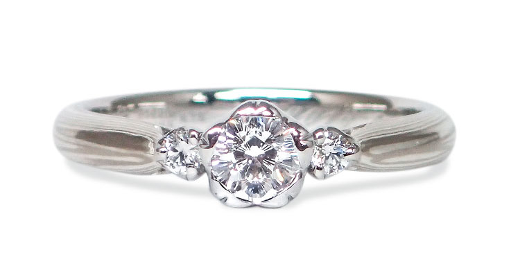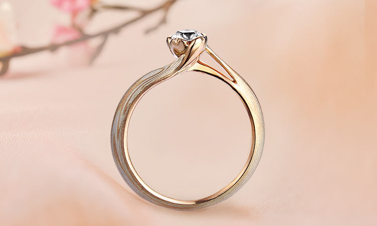 小さな桜がダイヤモンドの側面に花開く婚約指輪。