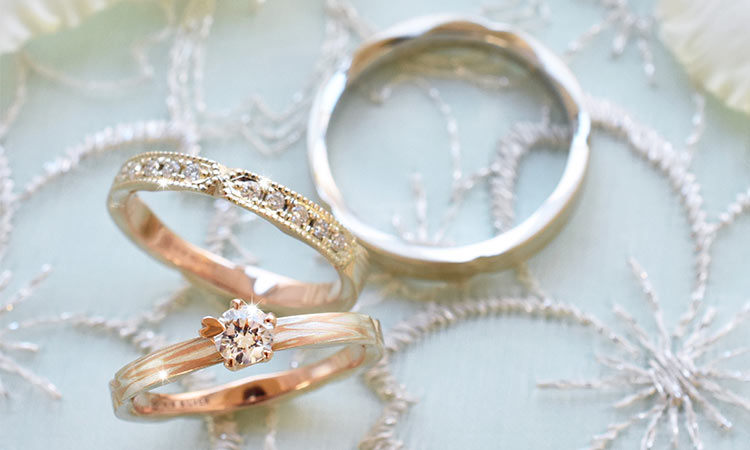 おそろいのデザインでぴったりと重ね付けできる婚約指輪も同じ木目金の板からお作りできます